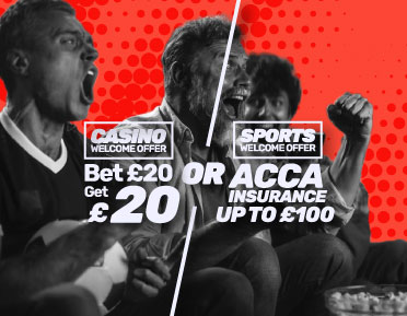 New here? Good timing. Get up to £100 back on a 5-leg ACCA Insurance to use across football, racing, tennis, whatever you fancy. Prefer casino? Wager £20 and there's a £20 bonus ready for you across slots and table games (10x wagering applies).